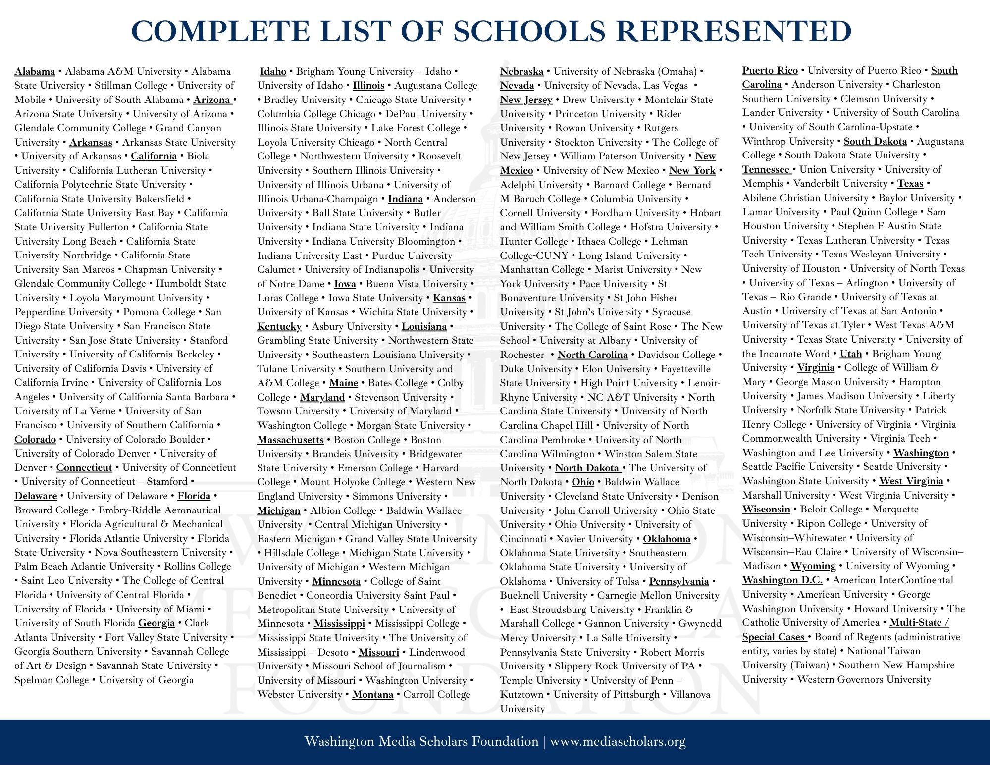 The Washington Media Scholars Foundation, a 501(c)(3) nonprofit organization, values diversity and is committed to creating an inclusive environment of all backgrounds and cultures. The Foundation is an equal opportunity organization and will not allow discrimination based upon age, ethnicity, ancestry, gender, national origin, disability, race, size, religion, sexual orientation, socioeconomic background, or any other status prohibited by law.© 2023 Washington Media Scholars Foundation
